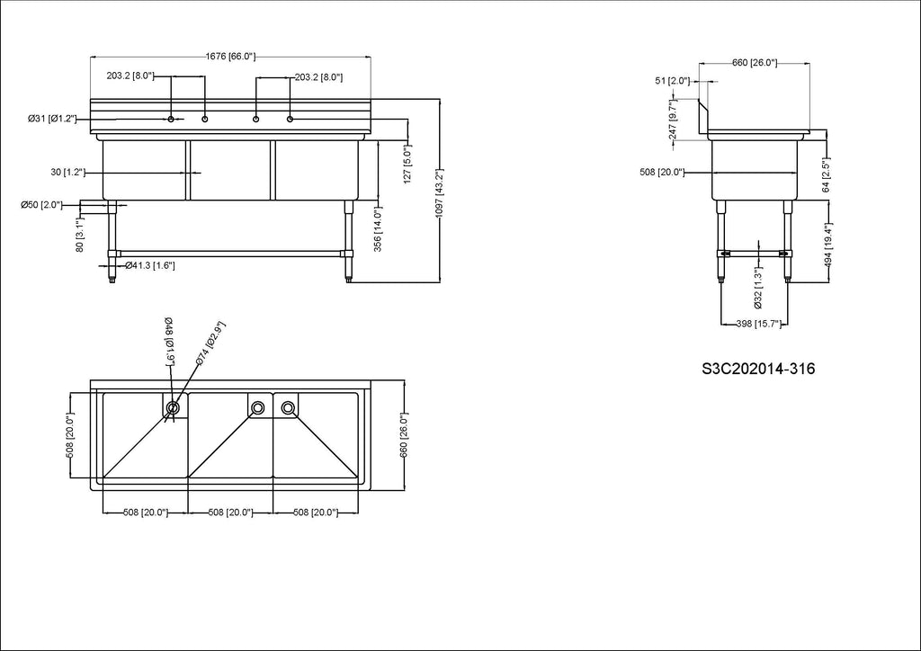 • Évier de 66 po de large (XS3C202014-316) : 66 po x 26 po x 44,5 po