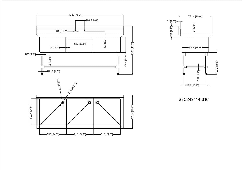 - Évier de 78 po de large (XS3C242414-316) : 78 po x 30 po x 44,5 po