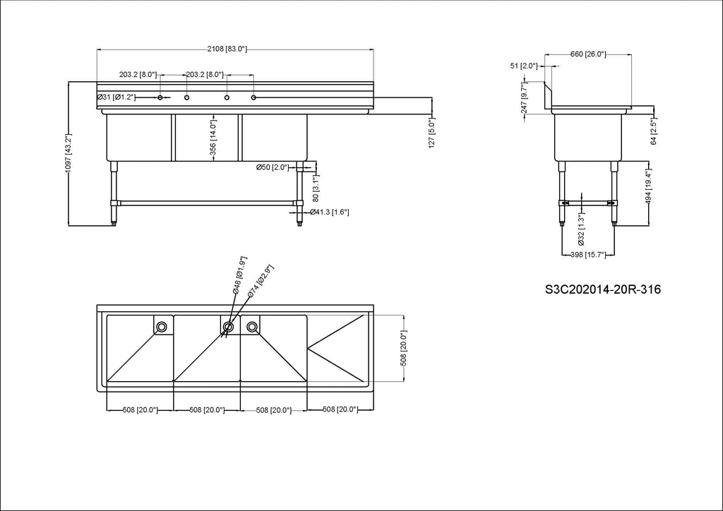 - Évier de 83 po de large (XS3C202014-20R-316) : 83 po x 26 po x 44,5 po