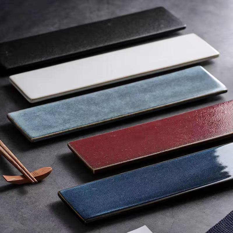 The 13" Rectangular off white Sushi Plate (JS3309W) is a stylish ceramic plate featuring a rich deep blue glaze that adds elegance to any table setting. It is ideal for serving sushi, sashimi, appetizers, or desserts in a refined presentation. Measuring 33 × 8.5 cm (13" × 3.35"), it combines beauty with functionality for both casual and formal dining.