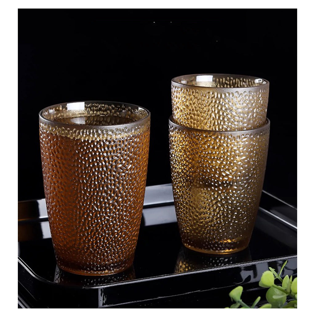 Le verre CHEFCO JB-8931B de 30 cl (10 oz) en acrylique ambré martelé est idéal pour servir de l'eau, des sodas et autres boissons glacées. Son design classique, avec sa surface extérieure gravée, offre une prise en main agréable. Fabriqué en acrylique transparent, il est facile à nettoyer et permet au personnel de voir facilement quand il faut le remplir. Grâce à sa conception en plastique résistant, c'est une option abordable comparée à la verrerie traditionnelle.