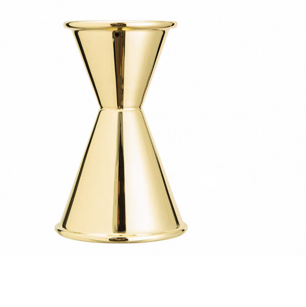 The CHEFCO Golden Stainless Steel Jigger, 15ml/30ml(SJ-30G)  sleek, hourglass-shaped jigger is cast in polished gold-tone metal and stands 6 cm/2.36" tall. One side has a 4 cm/1.57"-diameter cup (≈2 oz/60 ml) and the other a 3.2 cm/1.26"-diameter cup (≈1 oz/30 ml), making it perfect for precise cocktail pours.