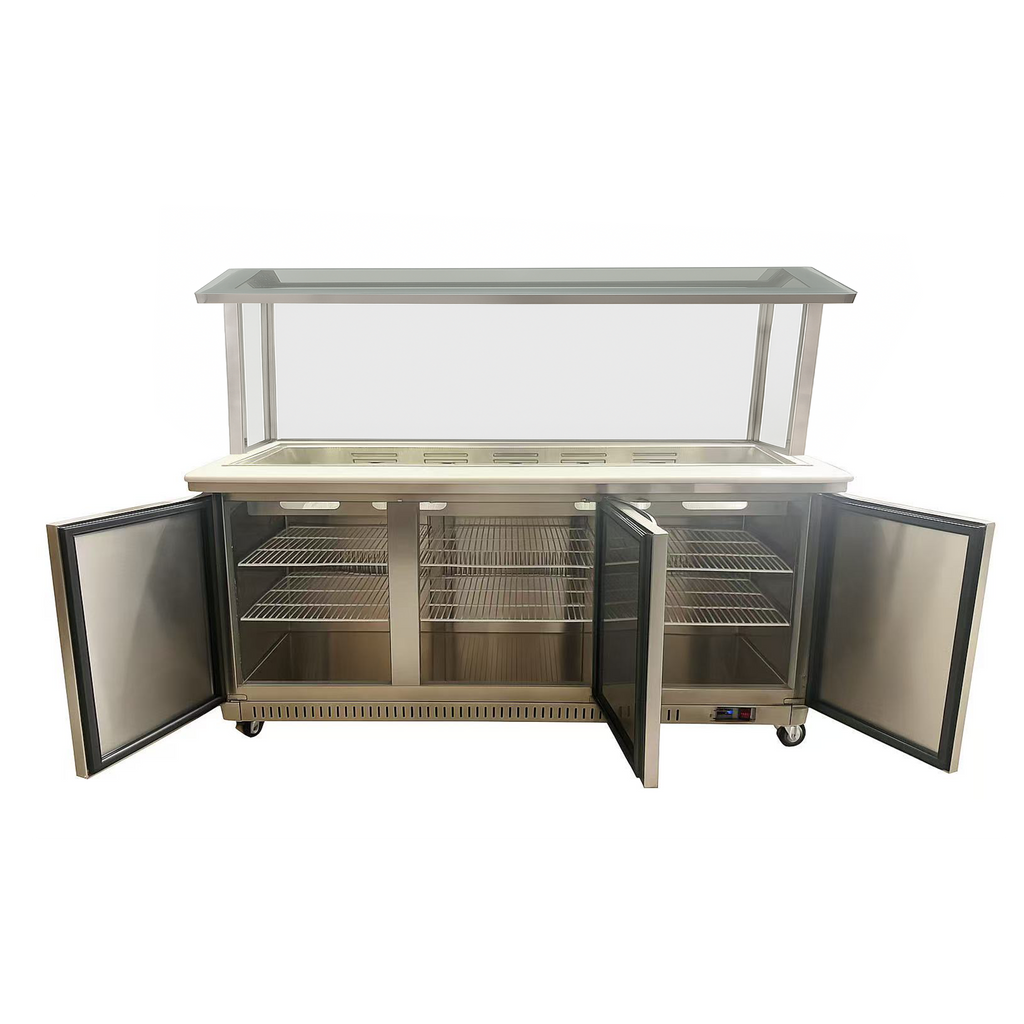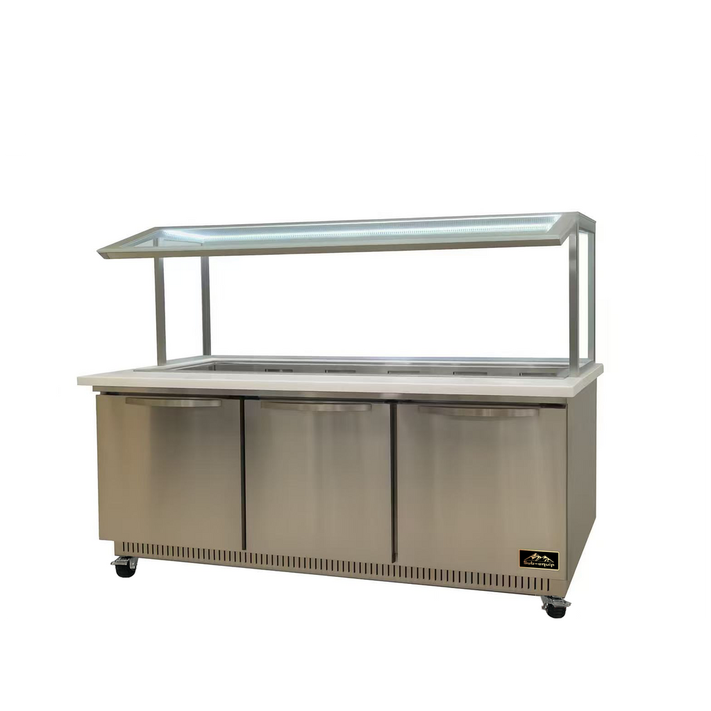 Table de préparation réfrigérée idéale pour les sandwichs et les salades. Notre gamme de tables de préparation haut de gamme est équipée d'une rangée supplémentaire de bacs de taille 1/6 pour un espace de rangement accru par rapport aux tables de préparation traditionnelles.
