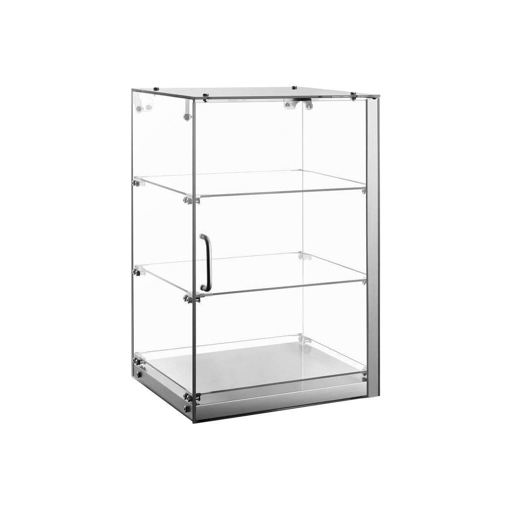 The unit features three glass shelves to maximize display space and a rear sliding door with handle for quick and convenient access during service. Built with anodized aluminum framing and a stainless steel base, it offers both durability and a clean, modern appearance suitable for any countertop display.