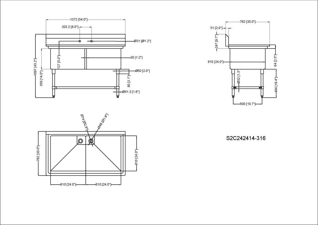 - Sink Bowl dimensions (W x D x H): 24" x 24" x 14"
