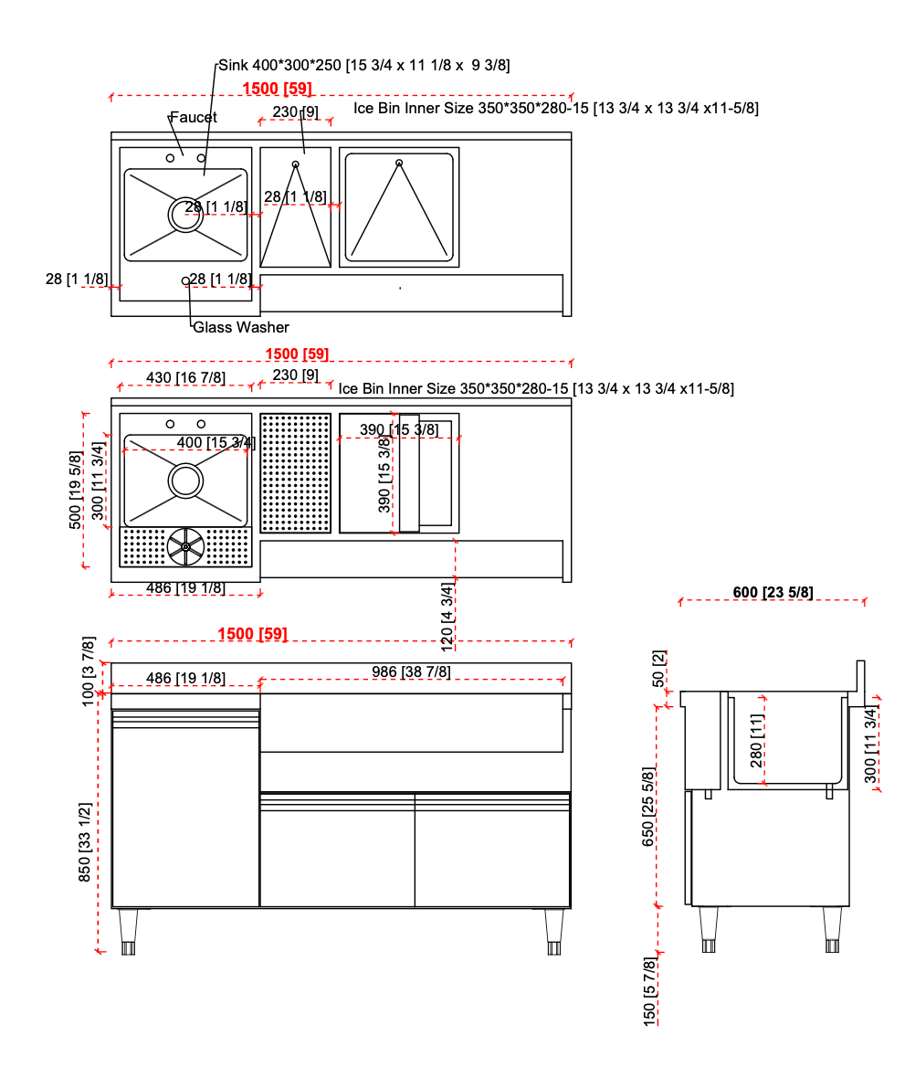 Dimensions ( W x D x H): 1500 x 600 x 850 mm or (59" x23 5/8" x 33 1/2")