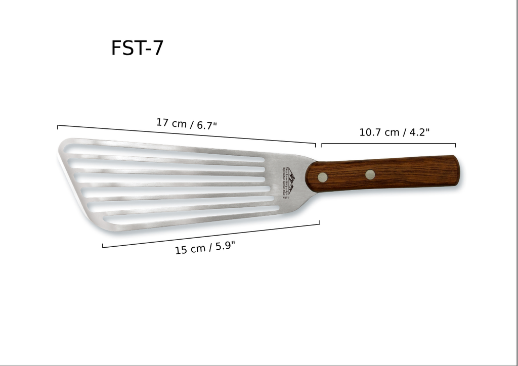 The FST-7 Fish Spatula is a 7" slotted spatula specially designed for flipping delicate foods like fish fillets. The blade measures 17 cm (6.7") in length and 15 cm (5.9") across the slotted edge, allowing for flexibility and precise handling. Crafted from high carbon stainless steel, it features a durable 10.7 cm (4.2") rosewood handle with triple rivets for a sturdy and comfortable grip. Perfect for both professional kitchens and home use.