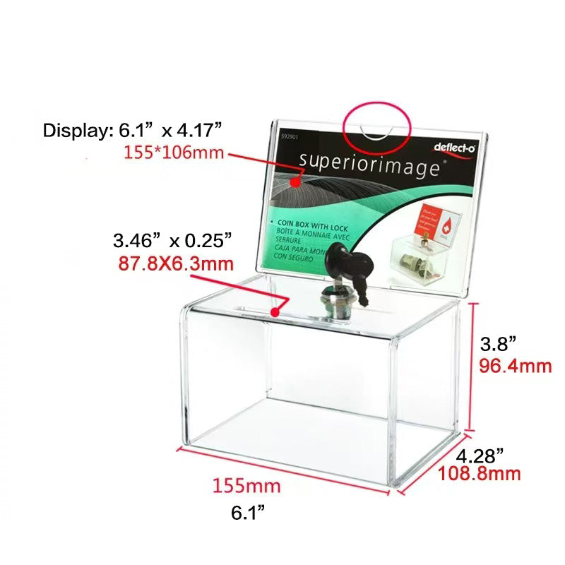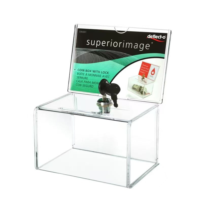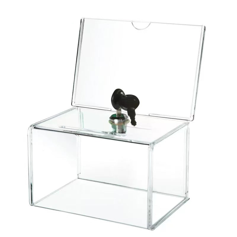 This clear acrylic coin box with lock is a versatile solution for collecting donations, ballots, suggestions, or tickets. Made from durable, transparent acrylic, it allows easy viewing of contents while maintaining a clean, professional look.