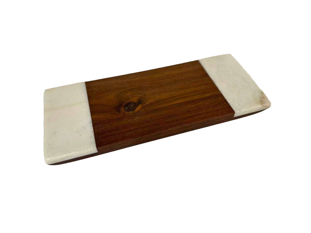 Elevate your table presentation with this modern wood serving board featuring elegant white slate ends. Perfect for serving cheese, sushi, appetizers, or charcuterie, this rectangular board combines natural warmth with contemporary design. Ideal for restaurants, catering, or home entertaining, it offers both style and durability. The raised base ensures stability and enhances food display, making it a perfect centerpiece for any dining occasion.
