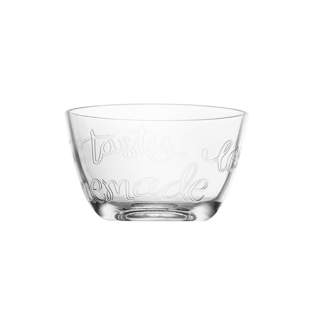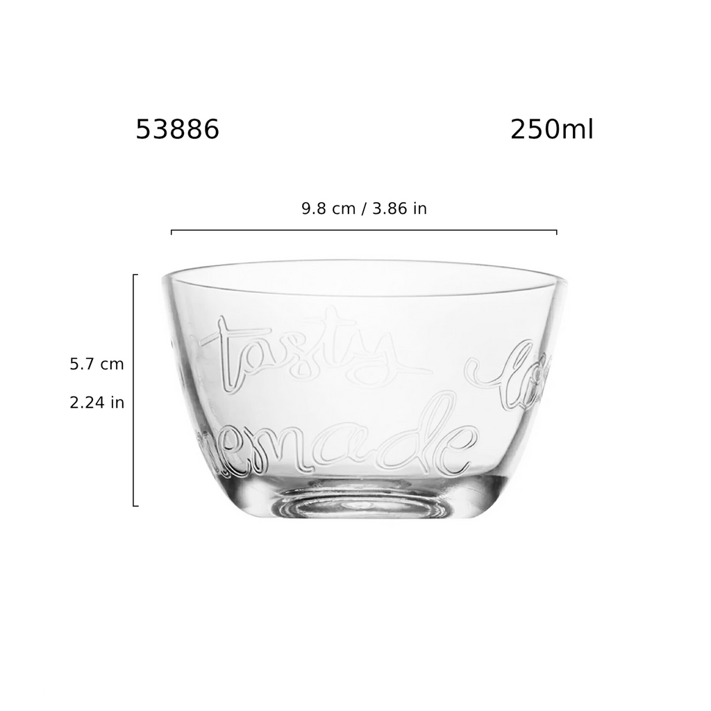 This is a clear glass bowl, model 53886, with a capacity of 250 ml. It measures 9.8 cm (3.86 inches) in diameter and 5.7 cm (2.24 inches) in height. The bowl features embossed text like “tasty” and “homemade,” giving it a charming and casual design—perfect for serving desserts, snacks, or small portions of food.