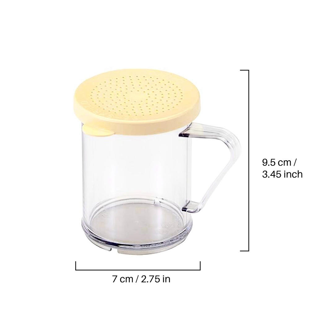 Shaker Dredge, 10oz,with Beige Lid(JW-SK280P), typically used for sprinkling powdered ingredients like sugar, flour, or cocoa powder. It features a clear body, allowing visibility of the contents, and a yellow perforated lid for easy sifting. The handle on the side makes it convenient to hold and use. With a size of 9.5 cm (3.45 inches) in height and 7 cm (2.75 inches) in diameter, it is compact and ideal for precise ingredient control in baking or cooking.