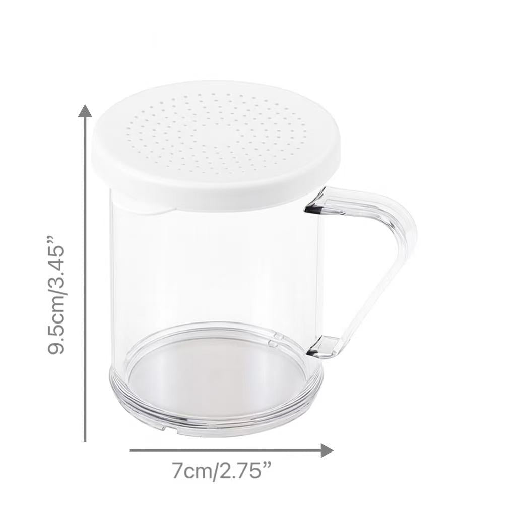 Shaker Dredge, 10oz,with Beige Lid(JW-SK280D), typically used for sprinkling powdered ingredients like sugar, flour, or cocoa powder. It features a clear body, allowing visibility of the contents, and a yellow perforated lid for easy sifting. The handle on the side makes it convenient to hold and use. With a size of 9.5 cm (3.45 inches) in height and 7 cm (2.75 inches) in diameter, it is compact and ideal for precise ingredient control in baking or cooking.