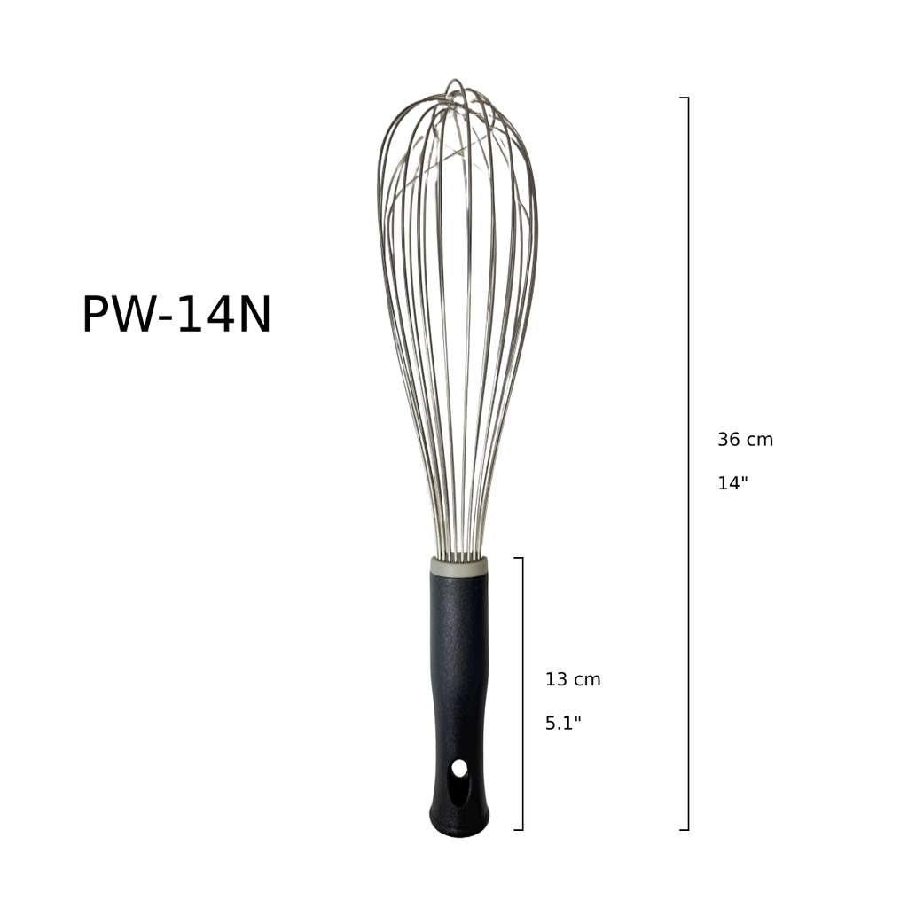 The Sub-equip 14" Piano Whisks, Nylon ( PW-14N) is designed with stainless steel wires and a sturdy nylon handle for a comfortable, non-slip grip. With its longer reach and more flexible wires, it's perfect for whipping air into mixtures like batters, cream, or egg whites. This size offers a balance between control and capacity—ideal for medium to large mixing bowls in both home and professional kitchens.