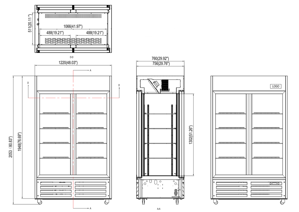 - Exterior Dimensions (W x D x H): 48"x 30"x 80 7/8" (1220 x 760 x 2053 mm)