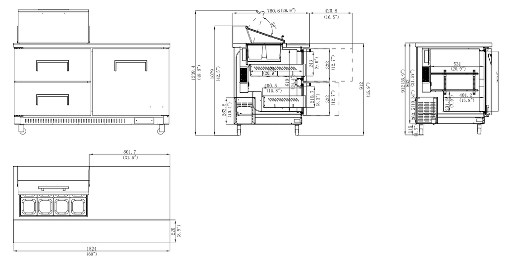 -Exterior Dimensions (W x D x H): 60" x 30" x35.9" or (48.8"), 8 Pans