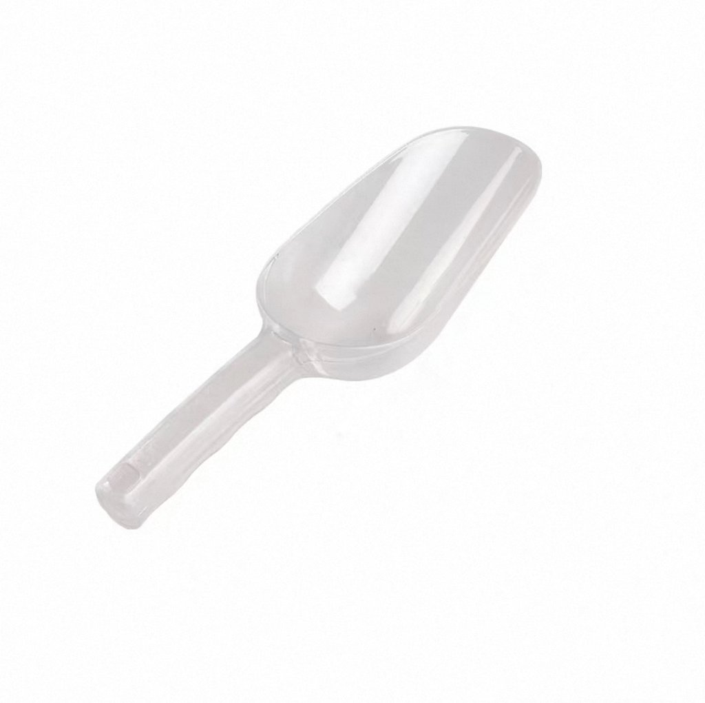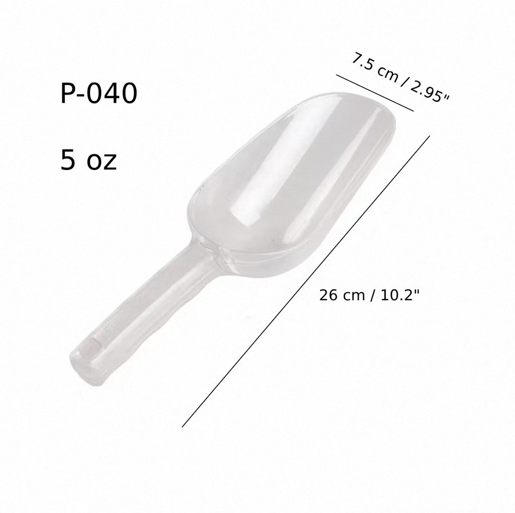 This clear polycarbonate scoop, model P-040, measures 26 cm (10.2") in length with a scoop width of 7.5 cm (2.95") and holds up to 5 oz. Made from durable, transparent polycarbonate, it is ideal for scooping dry goods, ice, or grains in both commercial and home kitchens.